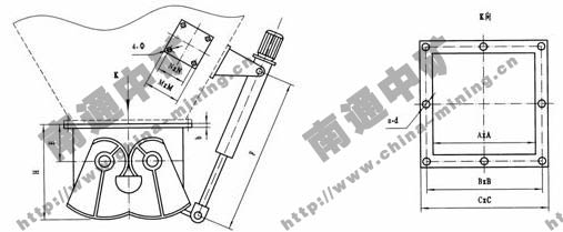 鄂式閘門由本體、扇形閘板、軸、齒輪、密封副,執行機構等部件構成。手動或執行機構推動搖桿,使齒輪帶動扇形閘板沿軸心旋轉,使兩個扇形閘板向兩邊開啟,物料隨即下落,待接料裝置滿載后,由執行機構帶動搖桿,使扇形閘板復位,關閉截斷下落的物料。