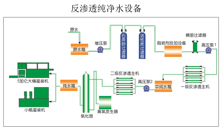 原水加壓送至水處理設備的預處理系統粗過濾,在進入精密過濾后,通過一級高壓泵加壓至一級反滲透設備,該系統產出的水再由二級加壓泵加壓送至二級反滲透設備,生產出產品的水。廣泛用于純凈水,制酒用水等。