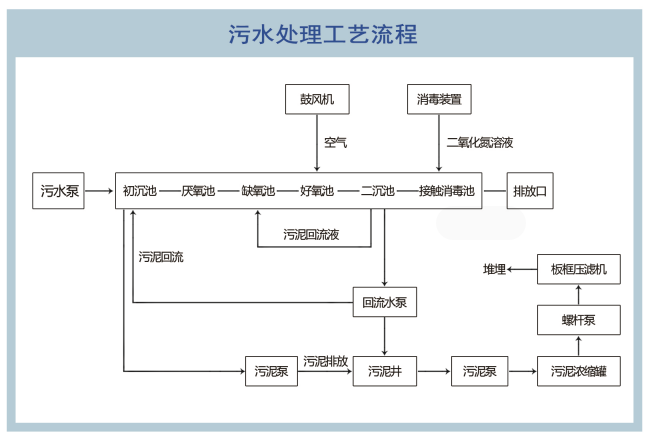 整個過程為通過粗格柵的原污水經過污水提升泵提升后,經過格柵或者砂濾器,之后進入沉砂池,經過砂水分離的污水進入初次沉淀池,以上為一級處理(即物理處理),初沉池的出水進入生物處理設備,有活性污泥法和生物膜法,(其中活性污泥法的反應器有曝氣池,氧化溝等,生物膜法包括生物濾池、生物轉盤、生物接觸氧化法和生物流化床),生物處理設備的出水進入二次沉淀池,二沉池的出水經過消毒排放或者進入三級處理,一級處理結束到此為二級處理,三級處理包括生物脫氮除磷法,混凝沉淀法,砂濾法,活性炭吸附法,離子交換法和電滲析法。二沉池的污泥一部分回流至初次沉淀池或者生物處理設備,一部分進入污泥濃縮池,之后進入污泥消化池,經過脫水和干燥設備后,污泥被最后利用。