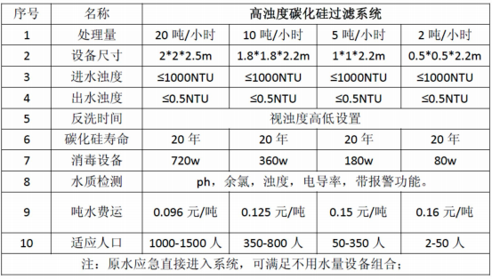 本系統采用高濁度(≤1000NTU) 原水經過自壓(0.2MPa) 壓進入過濾器,原水與瓷砂濾 料進行充分接觸攔截,瓷砂能夠截留水中大量雜質,出水濁度高于飲水標準指標,在經過0.1微 米孔徑的碳化硅過濾系統,出水濁度能達到0.5NTU 以下,若原水質特別差時,本系統還能夠 保證出水水質穩定,系統運行達到設定值時,自動啟動設備切換進行反沖洗,無人值守自 動控制系統自動如此往復運行,保證飲水指標,達到安全供水。