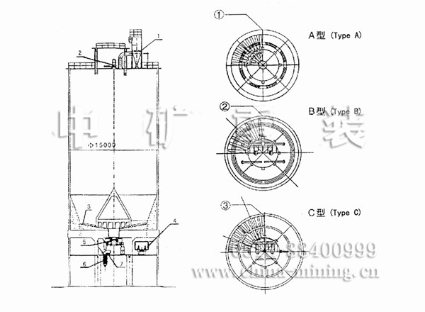 水泥儲存庫是在庫底中心位置設一錐形混合室,以降低庫內(nèi)的卸料壓力,消除漏斗流。混合室 設8~12個進料孔,在混合室和庫壁之間的環(huán)形區(qū)設有8~12個充氣區(qū),卸料時輪流向相對的環(huán)形小 區(qū)充氣,使部分水泥流向中心混合室。在自上而下的流動過程中,切割水平料層而產(chǎn)生重力混合作 用,進入混合室后又因混合室內(nèi)的連續(xù)充氣攪拌而進一步均化。這種庫的均化值可達5~9。電耗 0.15~0. 30kwh / t.