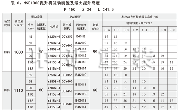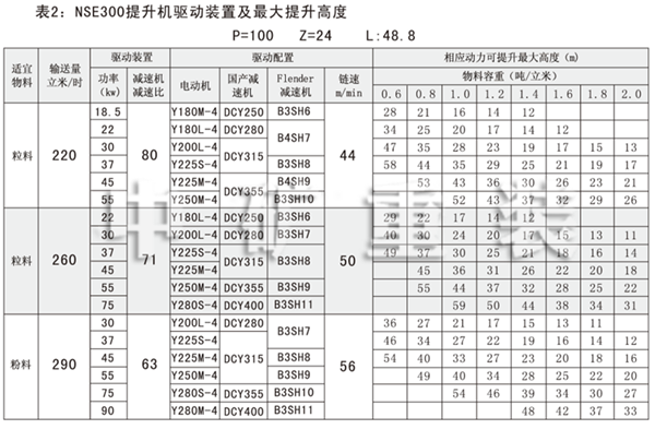 NSE系列高速板鏈斗式提升機共有九種基本型號:NSE100、NSE200、NSE300、NSE400、NSE500、NSE600、NSE700、NSE800、NSE1000,每種型號根據輸送物料的不同,選擇不同的提升速度,提升速度≤70m/min,提升高度65m。另外,中礦公司還可根據用戶要求輸送量介于上述型號之間的擴展型號。