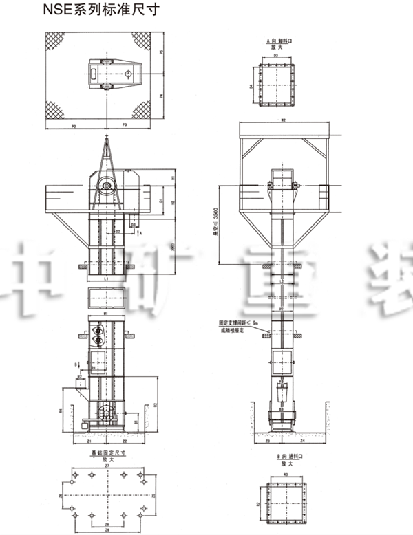 NSE板鏈式提升機由運行部件、驅動裝置、上部裝置、中部機殼、下部裝置組成。